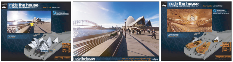 Diese 3 Screenshots zeigen eine besonders gelungene "virtuelle Tour" durch das Opernhaus in Sydney. Diese ermöglicht zahlreiche Ausblicke sowohl von Außen als auch vom Inneren des Gebäudes. Alle "Ebenen" des Innenraums sind interaktiv über die in der unteren rechten Bildhälfte platzierten Navigation erreichbar. Die jeweilige