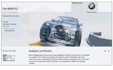 In Kombination mit Flash haben die Interaktionsmöglichkeiten von Videos bzw. Videosequenzen in den letzten 2 Jahren erheblich zugenommen, was wohl vor allem auf höheren Bandbreiten und effizienter Komprimierung zurückzuführen ist. Waren zuvor nur die standardisierten Aktionen wie z.B. "Stop", "Pause" oder "Play" bei der Wiedergabe eines Videos möglich, so werden nun Videosequenzen innerhalb von "Flash-Filmen" zu interaktiven "Handlungssträngen" einer Produktpräsentation. Häufig werden in Videosequenzen virtuelle mit realen Darstellungen überlagert, um z.B. Produktdetails oder Funktionsprinzipien zu veranschaulichen, um dann wieder fließend auf die reale Abbildung zu wechseln.